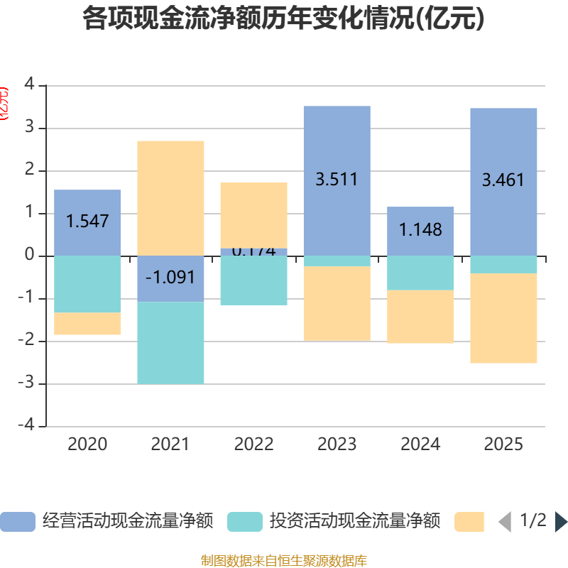 截至2025年,公司经营活动现金流净额为3.46亿元,同比增长201.41%;筹资活动现金流净额-2.11亿元,同比减少8602.38万元;投资活动现金流净额-4194.78万元,上年同期为-8126.46万元。