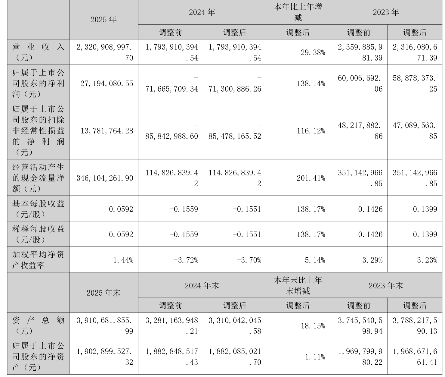 中证智能财讯盟固利(301487)4月18日披露2025年年度报告。2025年,公司实现营业总收入23.21亿元,同比增长29.38%;归母净利润2719.41万元,同比扭亏;扣非净利润1378.18万元,同比扭亏;经营活动产生的现金流量净额为3.46亿元,同比增长201.41%;报告期内,盟固利基本每股收益为0.0592元,加权平均净资产收益率为1.44%。公司2025年度分配预案为:拟向全体股东每10股派现0.061元(含税)。