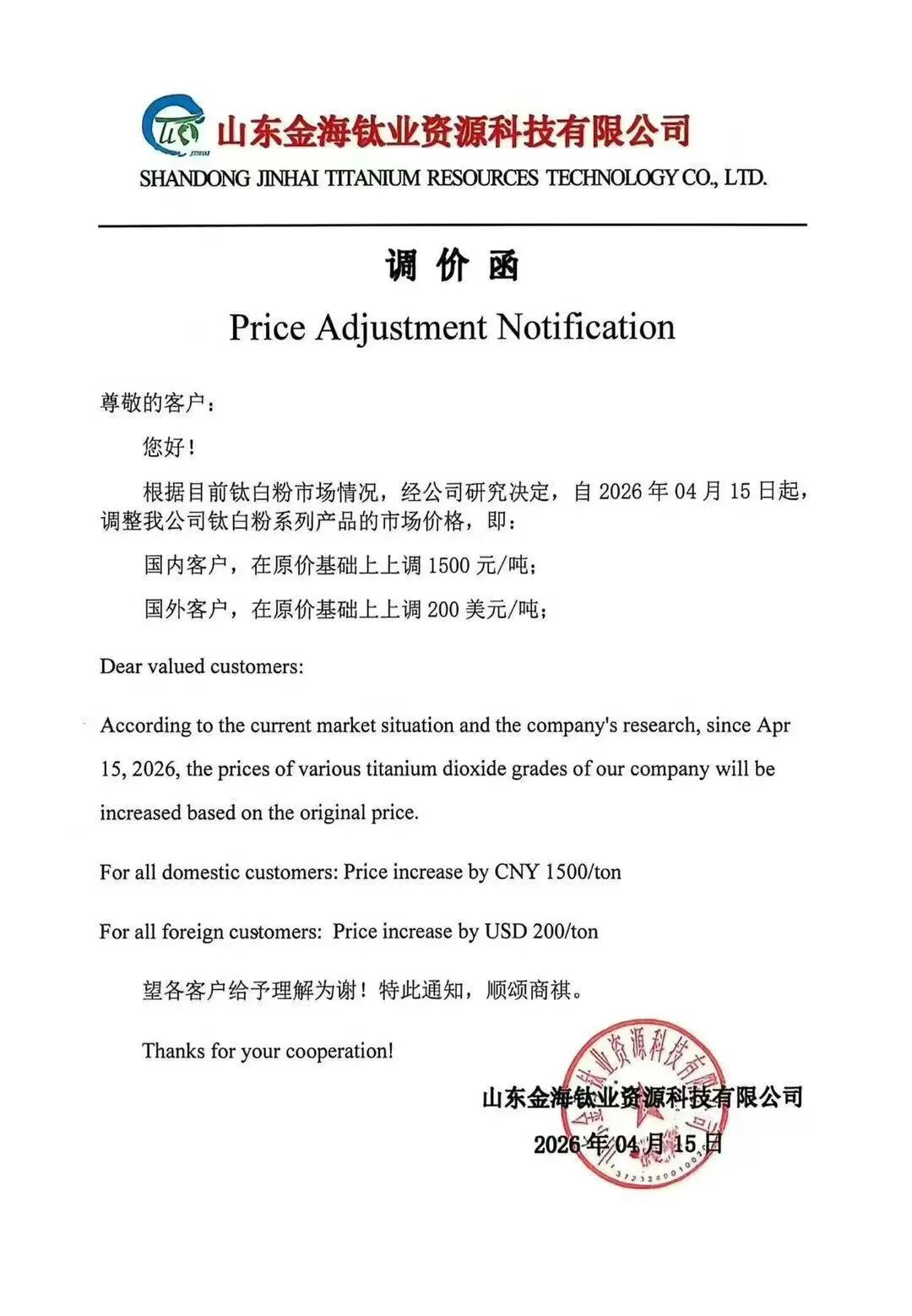 记者获悉,公司旗下两家钛白粉全资子公司金海钛业、祥海科技已于近日对外发布涨价函,上调钛白粉系列产品价格。函件显示,自4月15日起,国内客户在原价格基础上上调1500元/吨,国外客户在原价格基础上上调200美元/吨。