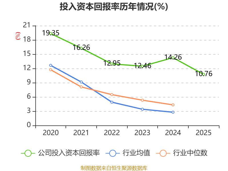 数据显示,2025年公司加权平均净资产收益率为15.72%,较上年同期下降6.52个百分点。公司2025年投入资本回报率为10.76%,较上年同期下降3.5个百分点。