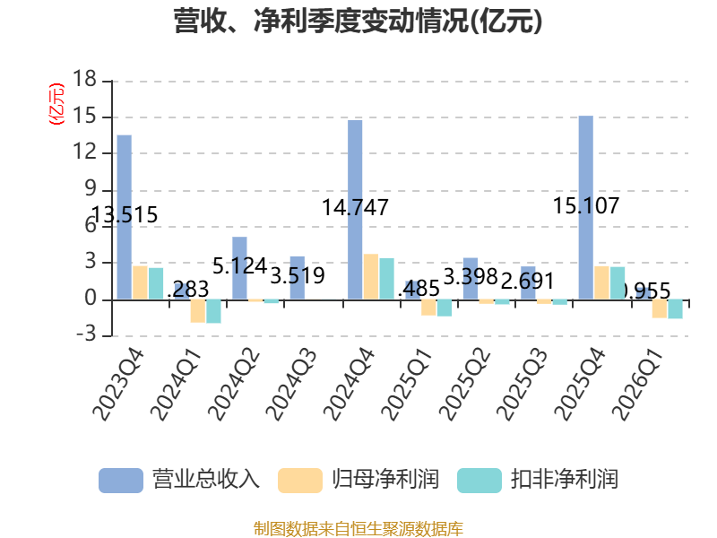 截至2026年一季度末,公司经营活动现金流净额为-4.07亿元,同比减少2.21亿元;筹资活动现金流净额195.17万元,同比增加476.22万元;投资活动现金流净额-6.17亿元,上年同期为-1915.61万元。