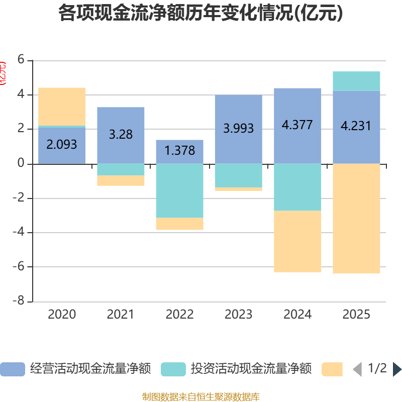 截至2025年,公司经营活动现金流净额为4.23亿元,同比下降3.34%;筹资活动现金流净额-6.37亿元,同比减少2.81亿元;投资活动现金流净额1.13亿元,上年同期为-2.74亿元。