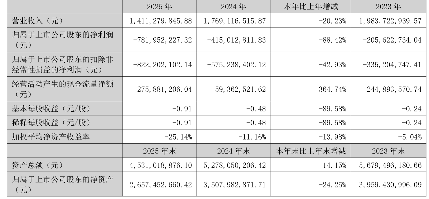 中证智能财讯国投智能(300188)4月18日披露2025年年度报告。2025年,公司实现营业总收入14.11亿元,同比下降20.23%;归母净利润亏损7.82亿元,上年同期亏损4.15亿元;扣非净利润亏损8.22亿元,上年同期亏损5.75亿元;经营活动产生的现金流量净额为2.76亿元,同比增长364.74%;报告期内,国投智能基本每股收益为-0.91元,加权平均净资产收益率为-25.14%。