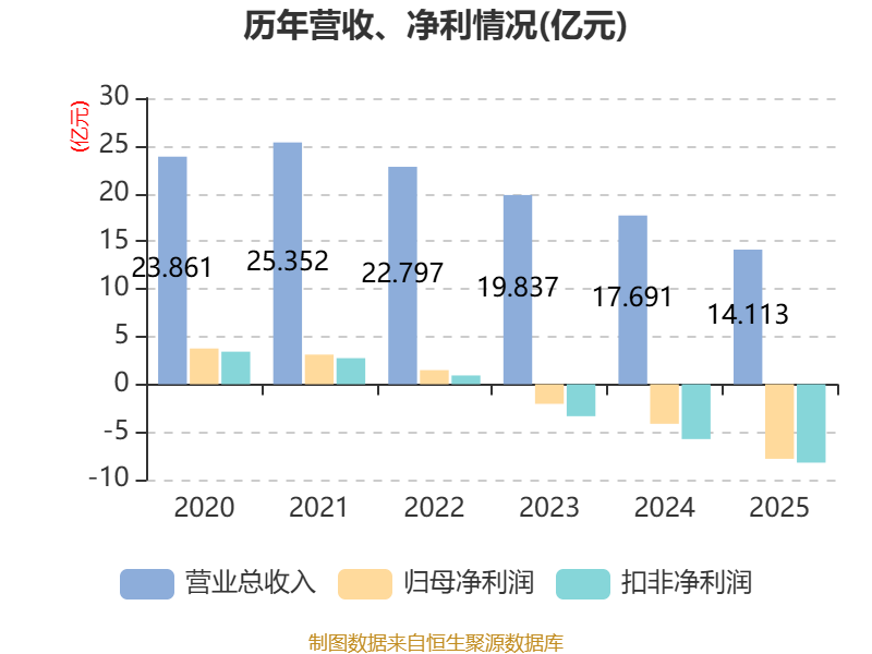 数据显示,2025年公司加权平均净资产收益率为-25.14%,较上年同期下降13.98个百分点。公司2025年投入资本回报率为-20.28%,较上年同期下降10.5个百分点。