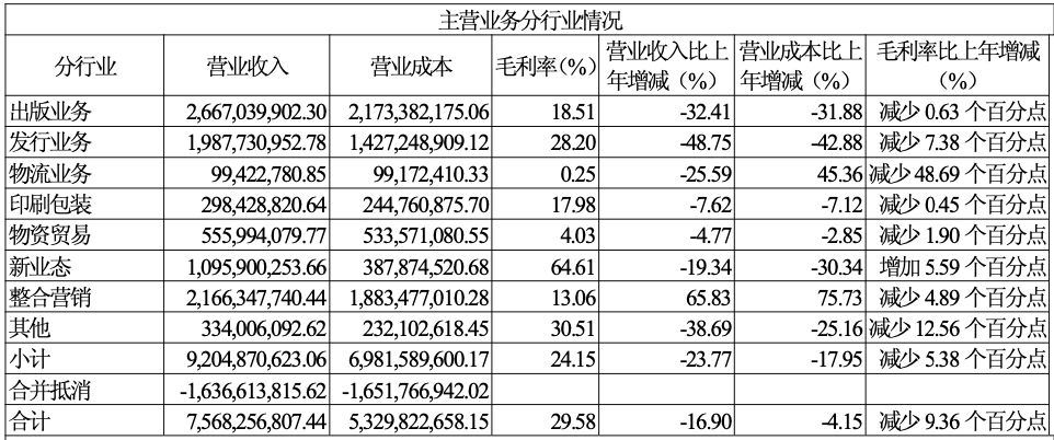 分行业来看,出版业务、发行业务、物流业务、印刷包装业务报告期内营业收入分别同比减少32.41%、48.75%、25.59%、7.62%,毛利率分别同比减少0.63%、7.38%、48.69%、0.45%。