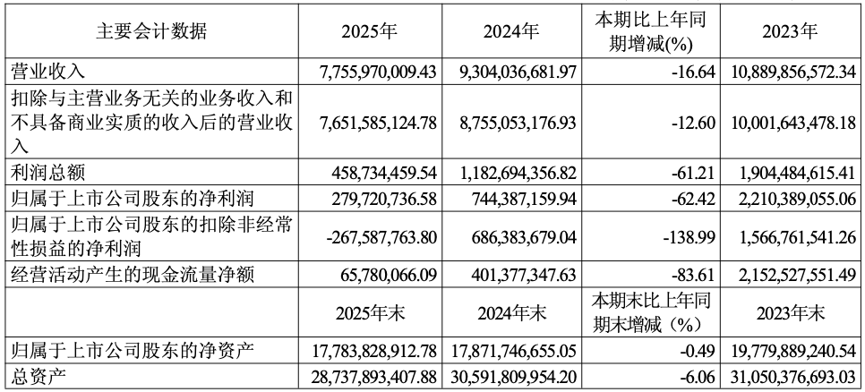 报告期内,公司实现经营活动产生的净现金流量为0.66亿元,同比下降83.61%,主要系本期营业收入规模下降等影响所致。报告期末,公司资产总额为287.38亿元,同比下降6.06%;归属于上市公司股东的净资产177.84亿元,同比下降0.49%。