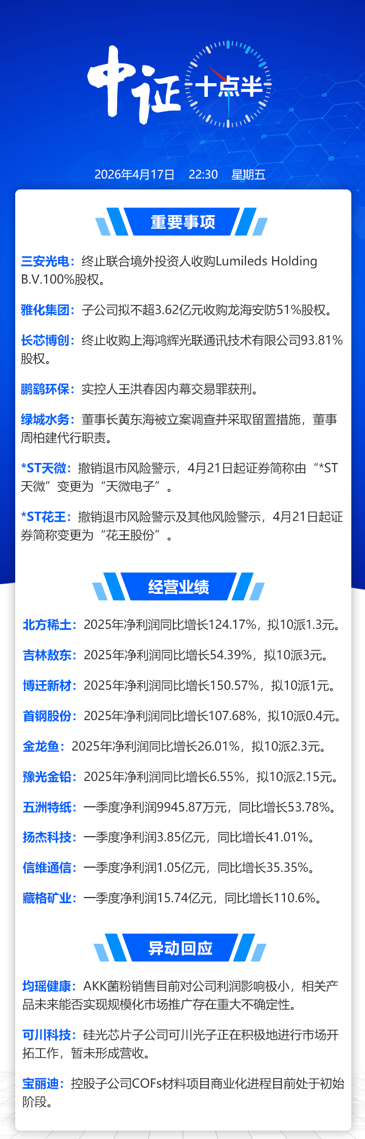 【中证十点半】长芯博创终止收购上海鸿辉光联93.81%股权;鹏鹞环保实控人因内幕交易罪获刑;均瑶健康提示风险