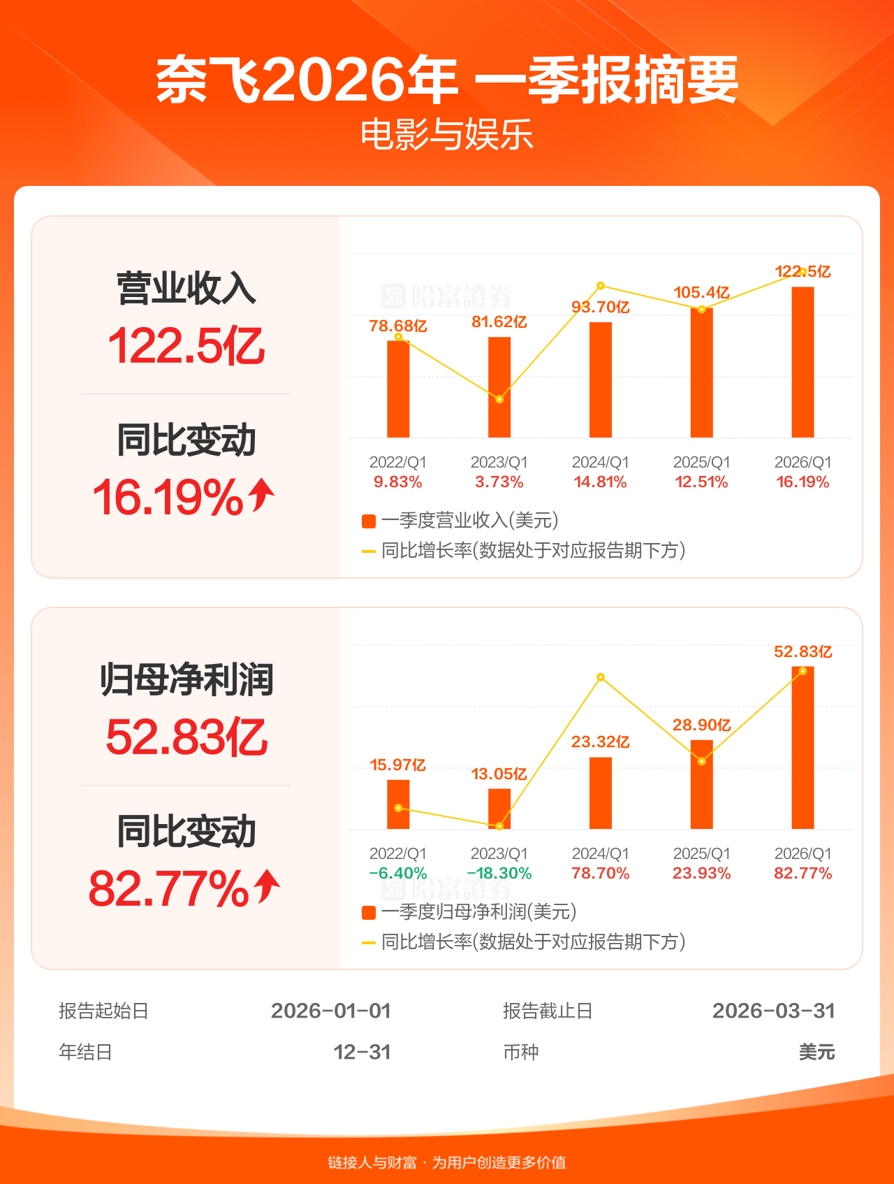 奈飞4月16日发布一季报业绩,截至2026年3月31日的3个月内,该公司营业收入122.50亿美元,同比增长16.19%;公司权益持有人应占溢利(归母净利润)52.83亿美元,同比增长82.77%。