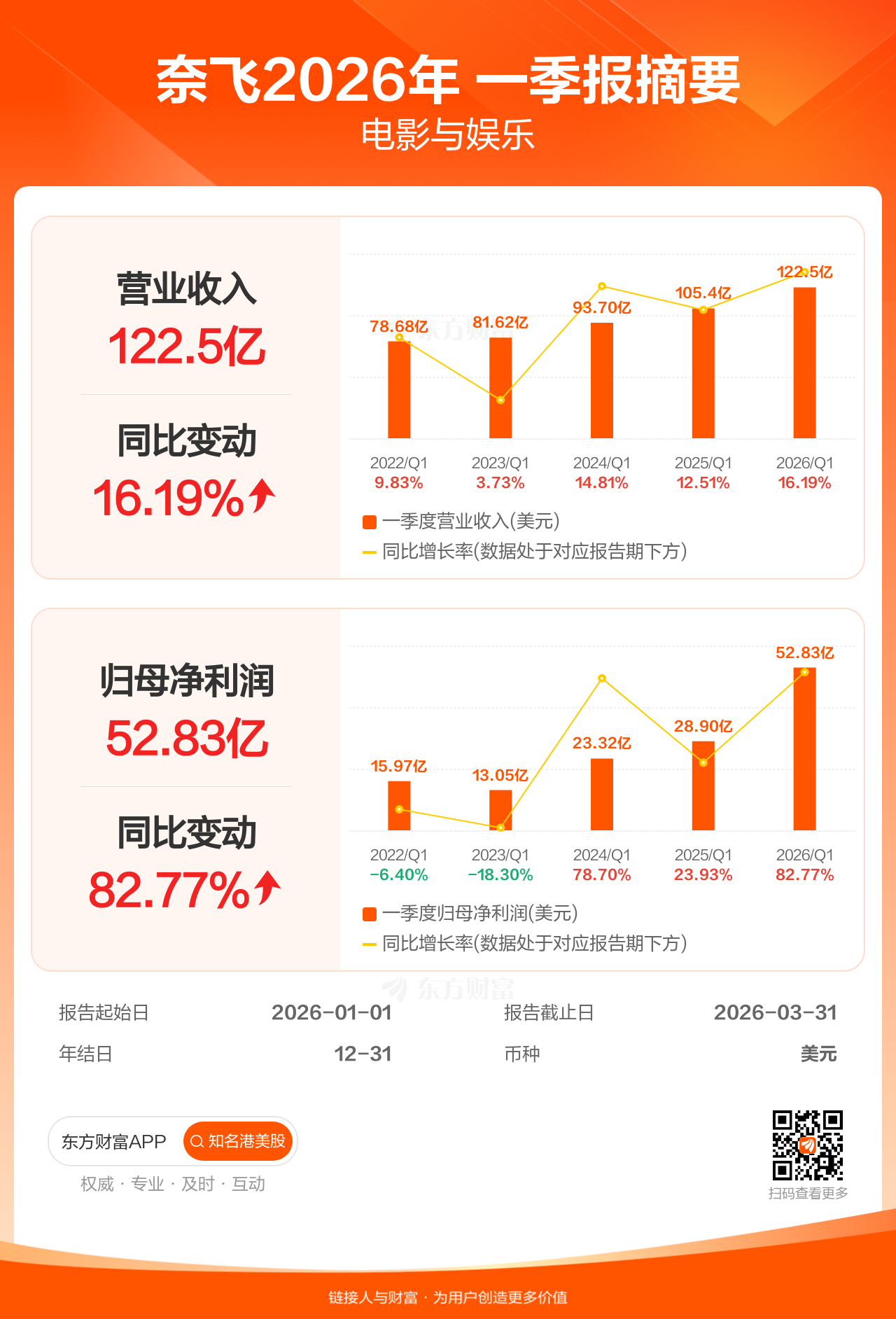 奈飞4月16日发布一季报业绩,截至2026年3月31日的3个月内,该公司营业收入122.50亿美元,同比增长16.19%;公司权益持有人应占溢利(归母净利润)52.83亿美元,同比增长82.77%。