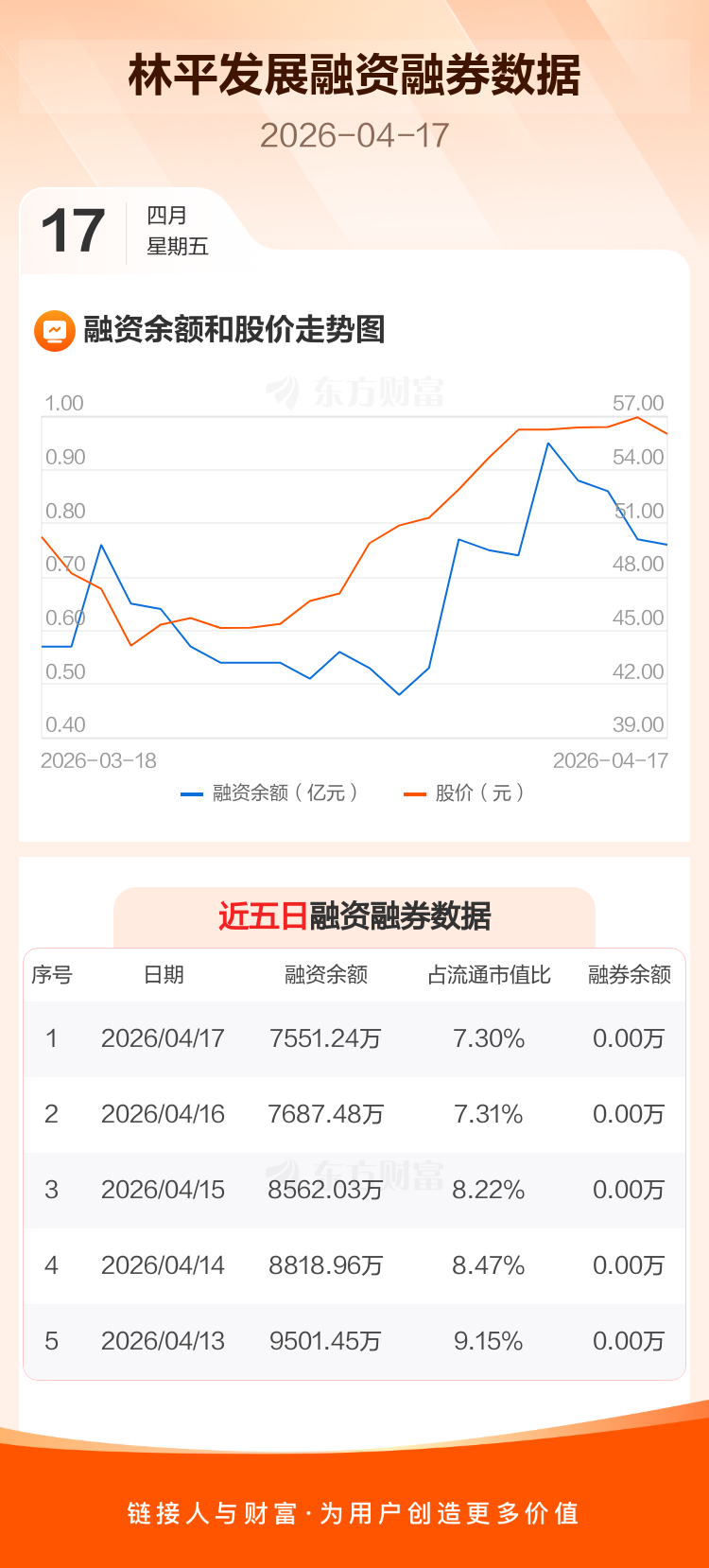 交易所最新数据显示,林平发展于2026年4月17日获融资买入2054.80万元,融资偿还2191.04万元,当日融资净偿还136.24万元。目前,该股融资余额7551.24万,占流通市值比例为7.30%。