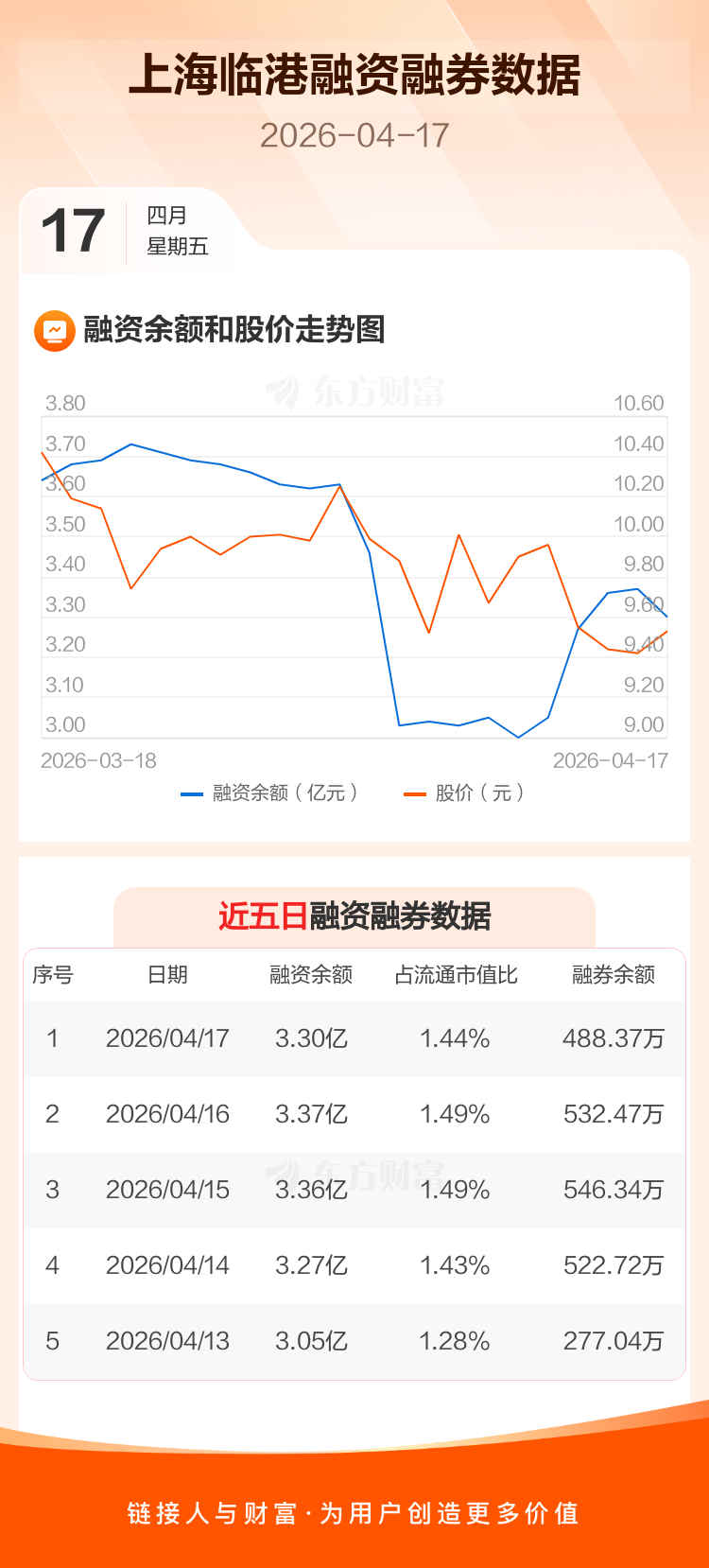 交易所最新数据显示,上海临港于2026年4月17日获融资买入1810.32万元,融资偿还2548.48万元,当日融资净偿还738.16万元。目前,该股融资余额3.30亿,占流通市值比例为1.44%。