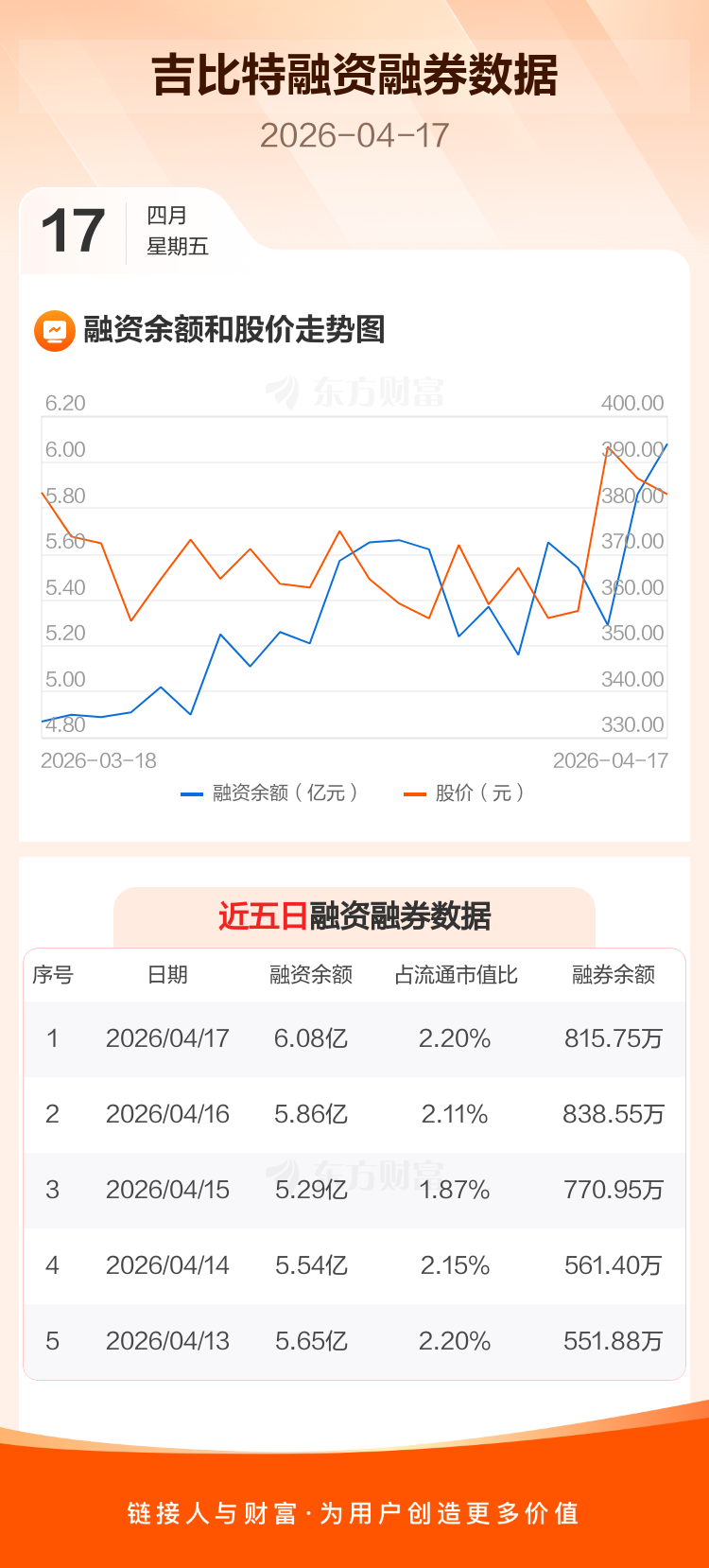 交易所最新数据显示,吉比特于2026年4月17日获融资买入1.05亿元,融资偿还8362.79万元,当日融资净买入2170.57万元。目前,该股融资余额6.08亿,占流通市值比例为2.20%。