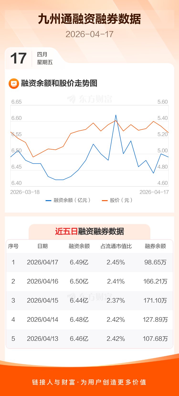 交易所最新数据显示,九州通于2026年4月17日获融资买入1299.17万元,融资偿还1420.66万元,当日融资净偿还121.49万元。目前,该股融资余额6.49亿,占流通市值比例为2.45%。