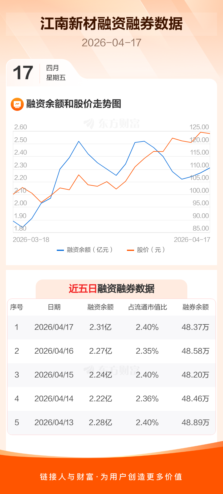 交易所最新数据显示,江南新材于2026年4月17日获融资买入2038.42万元,融资偿还1659.98万元,当日融资净买入378.44万元。目前,该股融资余额2.31亿,占流通市值比例为2.40%。