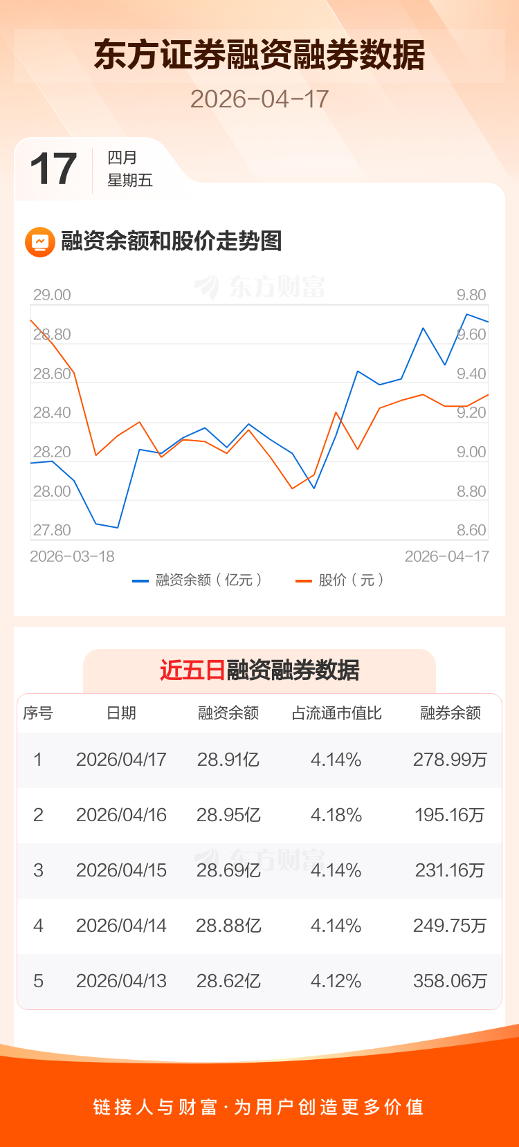 交易所最新数据显示,东方证券于2026年4月17日获融资买入7692.71万元,融资偿还8097.70万元,当日融资净偿还404.99万元。目前,该股融资余额28.91亿,占流通市值比例为4.14%。