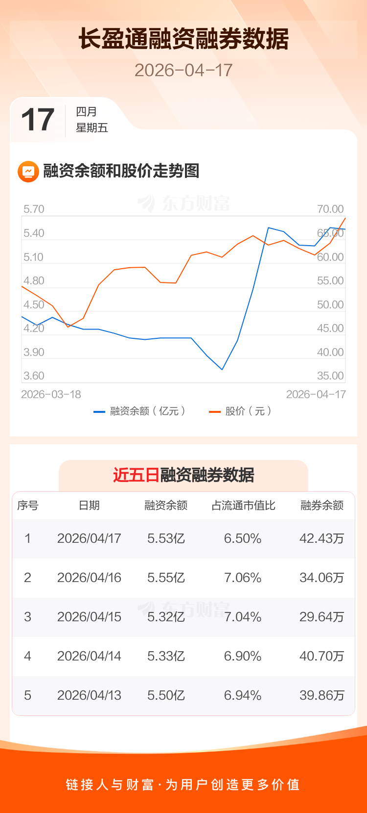 交易所最新数据显示,长盈通于2026年4月17日获融资买入1.39亿元,融资偿还1.41亿元,当日融资净偿还198.82万元。目前,该股融资余额5.53亿,占流通市值比例为6.50%。