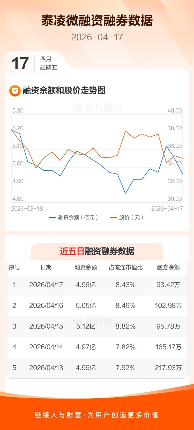 交易所最新数据显示,泰凌微于2026年4月17日获融资买入2650.90万元,融资偿还3484.49万元,当日融资净偿还833.58万元。目前,该股融资余额4.96亿,占流通市值比例为8.43%。