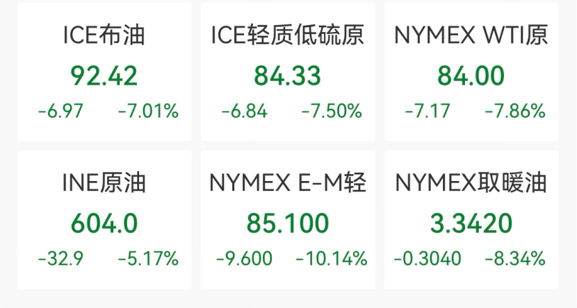 布伦特原油收跌7.01%,报92.42美元/桶,本周累跌2.92%。