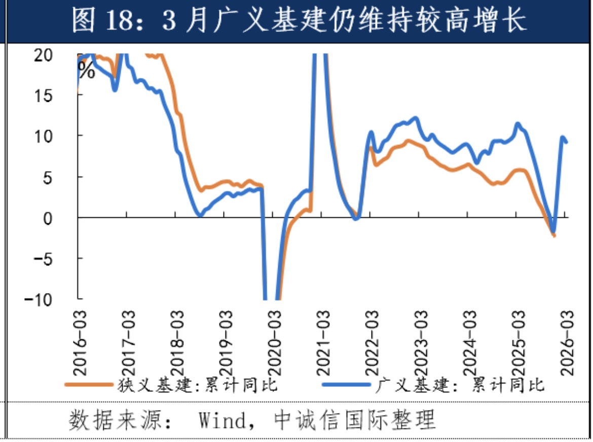 王青认为,今年一季度基建投资超预期增长,除了基建项目储备充分外,还因为今年国家单列并提高了用于项目建设的地方政府专项债券额度。这让一季度基建投资的资金来源更有保障。与此同时,2025年10月5000亿新型政策性金融工具投放完毕,对基建投资的拉动效应也开始显现。