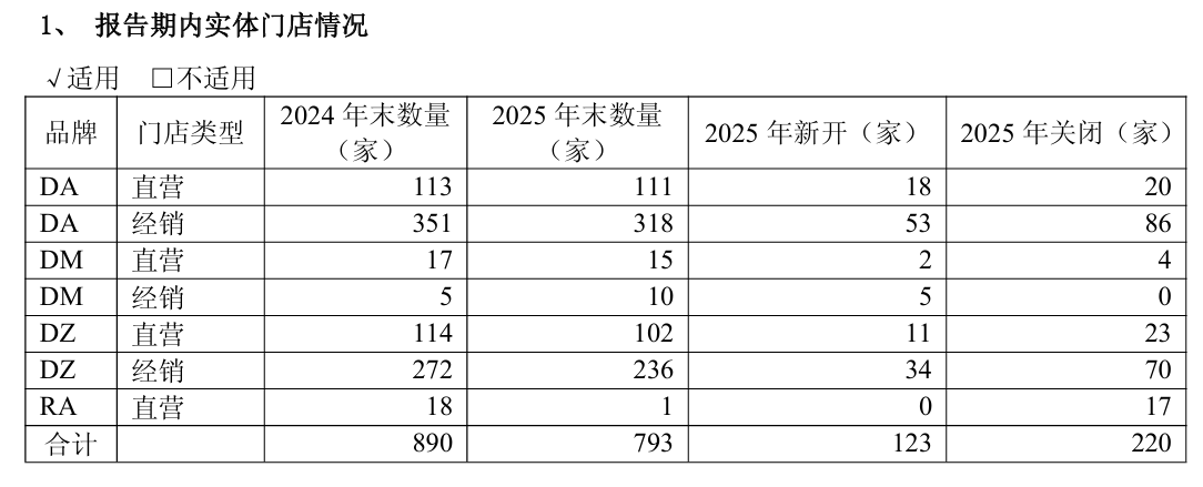 2025年,地素时尚新开123家实体门店,关闭220家实体门店。截至2025年12月31日,该公司实体门店数量为793家,同比减少97家。