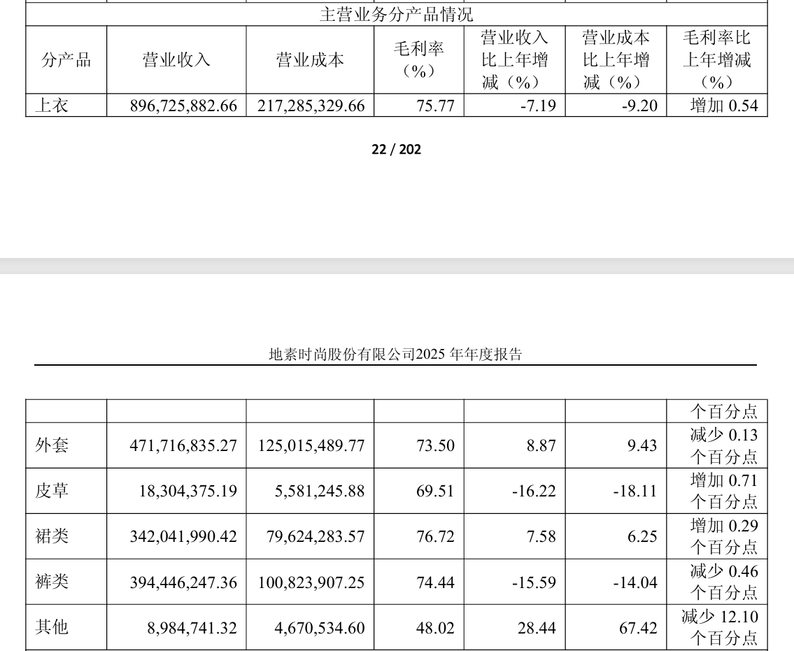 分产品来看,2025年,地素时尚上衣、皮草、裤类产品营收同比分别减少7.19%、16.22%、15.59%,外套、裙类、其他产品营收同比分别增加8.87%、7.58%、28.44%。