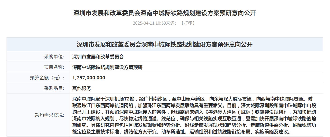 2025年9月,中国政府采购网公告显示,“深南中城际铁路规划建设方案预研”项目被中铁第五勘察设计院集团有限公司、深圳国家高技术产业创新中心以168.1万元中标,这一跨珠江口线路再获实质性进展。