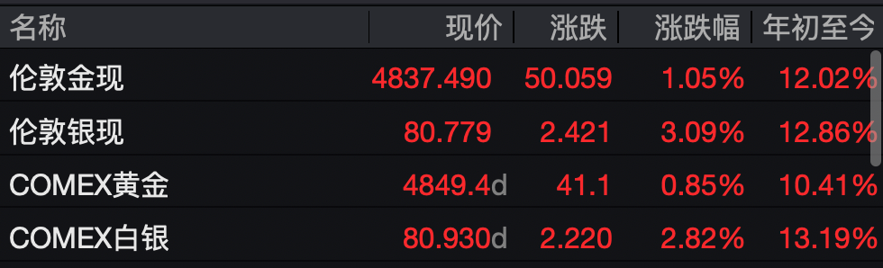 受中东局势影响,金银价格大涨,现货黄金涨1.05%,报4837.49美元/盎司;COMEX黄金期货涨0.85%,报4849.4美元/盎司;现货白银涨3.09%,报80.779美元/盎司;COMEX白银期货涨3.09%,报81.720美元/盎司。