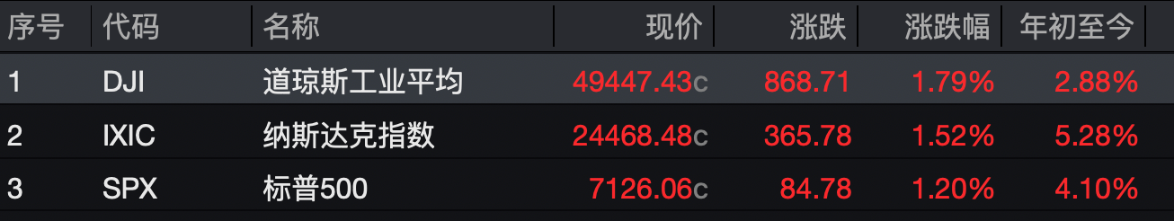 美股三大指数收盘涨幅均超1%,标普、纳指续创历史新高。
