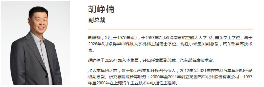公开资料显示,胡峥楠5年前开始担任顺为投资合伙人与小米汽车顾问。此前,他曾创立业内知名的上海龙创汽车设计公司,并先后在多家车企任职,也曾主导多款热销车型的整车开发工作,在整车架构和产品设计领域经验丰富。