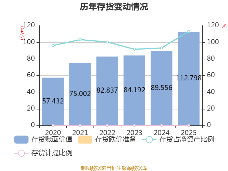 从存货变动来看,截至2025年末,公司存货账面价值为112.8亿元,占净资产的113.01%,较上年末增加23.24亿元。公司本期没有计提存货跌价准备。