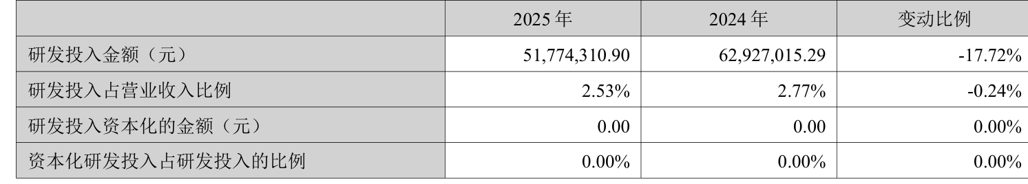 2025年全年,公司研发投入金额为5177.43万元,同比下降17.72%;研发投入占营业收入比例为2.53%,相比上年同期下降0.24个百分点。此外,公司全年研发投入资本化率为0%。