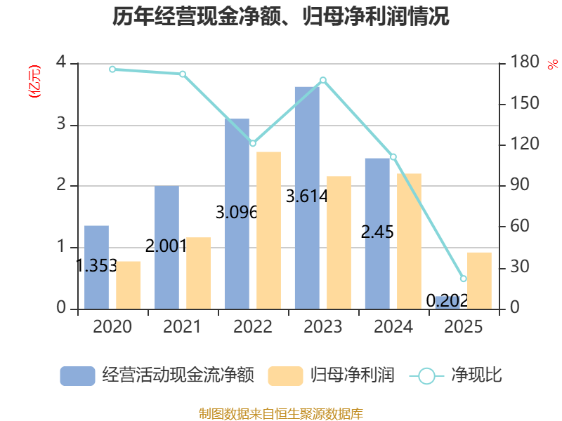 截至2025年,公司经营活动现金流净额为2018.37万元,同比下降91.76%;筹资活动现金流净额5.99亿元,同比增加6.44亿元;投资活动现金流净额-6.27亿元,上年同期为-1.51亿元。