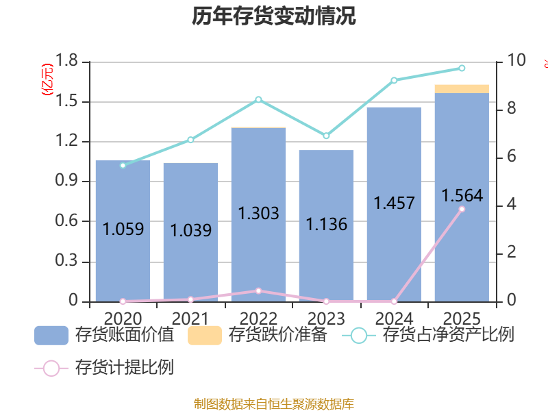 从存货变动来看,截至2025年末,公司存货账面价值为1.56亿元,占净资产的9.73%,较上年末增加1073.74万元。其中,存货跌价准备为627.25万元,计提比例为3.85%。