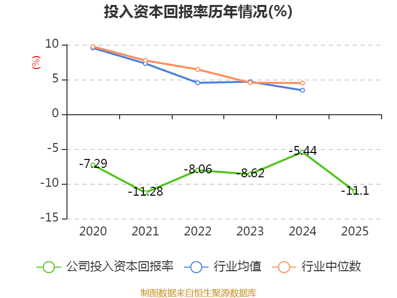 数据显示,2025年公司加权平均净资产收益率为-32.01%,较上年同期下降15.44个百分点。公司2025年投入资本回报率为-11.1%,较上年同期下降5.66个百分点。
