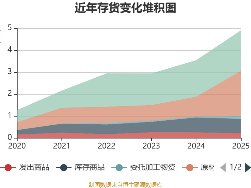 从存货变动来看,截至2025年末,公司存货账面价值为4.9亿元,占净资产的60.78%,较上年末增加1.36亿元。其中,存货跌价准备为1192.43万元,计提比例为2.37%。