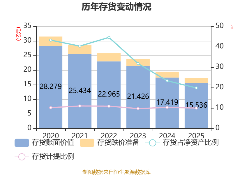 从存货变动来看,截至2025年末,公司存货账面价值为15.54亿元,占净资产的19.8%,较上年末减少1.88亿元。其中,存货跌价准备为1.71亿元,计提比例为9.92%。