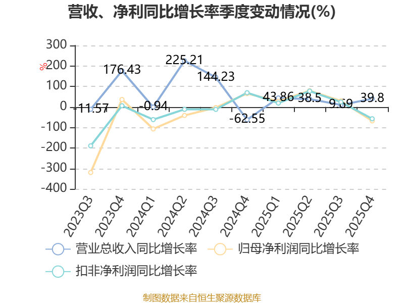 中证智能财讯蓝丰生化(002513)4月18日披露2025年年度报告。2025年,公司实现营业总收入23.42亿元,同比增长30.61%;归母净利润亏损1.91亿元,上年同期亏损2.53亿元;扣非净利润亏损1.88亿元,上年同期亏损2.32亿元;经营活动产生的现金流量净额为-3.76亿元,上年同期为1.06亿元;报告期内,蓝丰生化基本每股收益为-0.5077元。