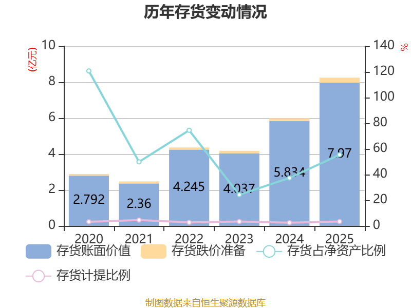 从存货变动来看,截至2025年末,公司存货账面价值为7.97亿元,占净资产的55.41%,较上年末增加2.14亿元。其中,存货跌价准备为2802.63万元,计提比例为3.4%。