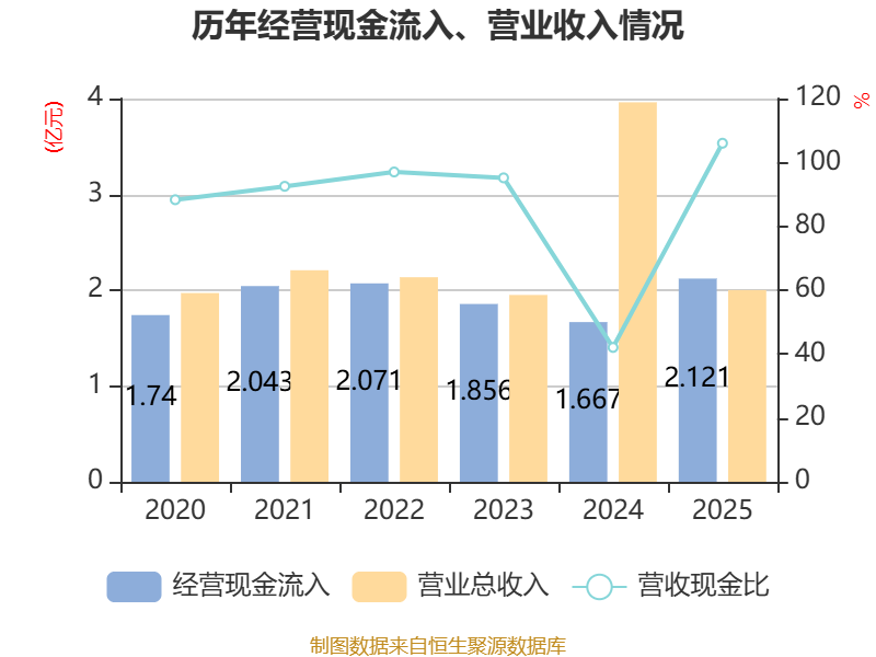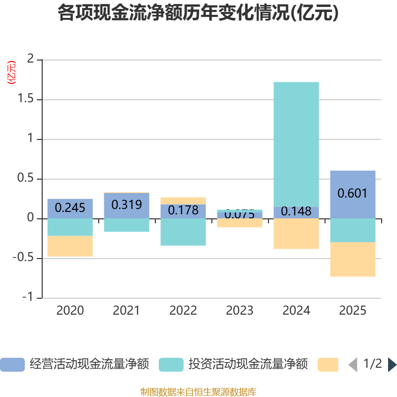 截至2025年,公司经营活动现金流净额为6011.3万元,同比增长305.48%;筹资活动现金流净额-4343.03万元,同比减少495.24万元;投资活动现金流净额-2997.49万元,上年同期为1.57亿元。