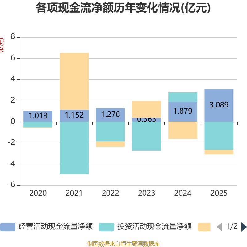 截至2025年,公司经营活动现金流净额为3.09亿元,同比增长64.34%;筹资活动现金流净额-4203.91万元,同比增加1.19亿元;投资活动现金流净额-2.67亿元,上年同期为9051.35万元。