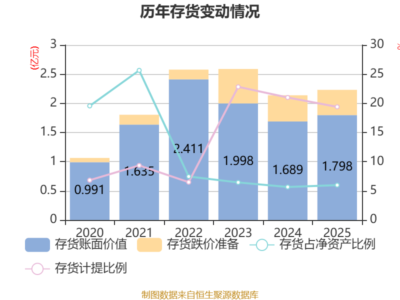 从存货变动来看,截至2025年末,公司存货账面价值为1.8亿元,占净资产的5.98%,较上年末增加1089.29万元。其中,存货跌价准备为4328.83万元,计提比例为19.4%。
