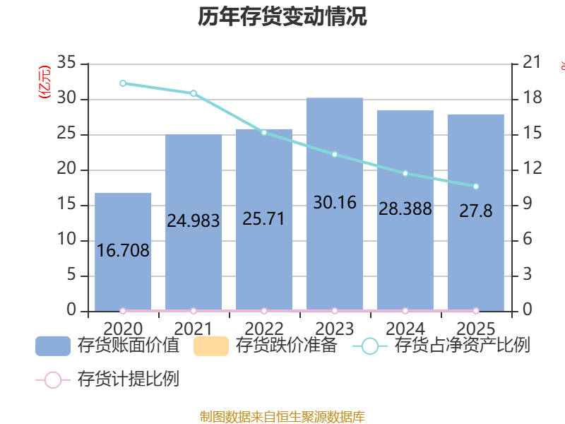 从存货变动来看,截至2025年末,公司存货账面价值为27.8亿元,占净资产的10.57%,较上年末减少5879.4万元。其中,存货跌价准备为22.06万元,计提比例为0.01%。