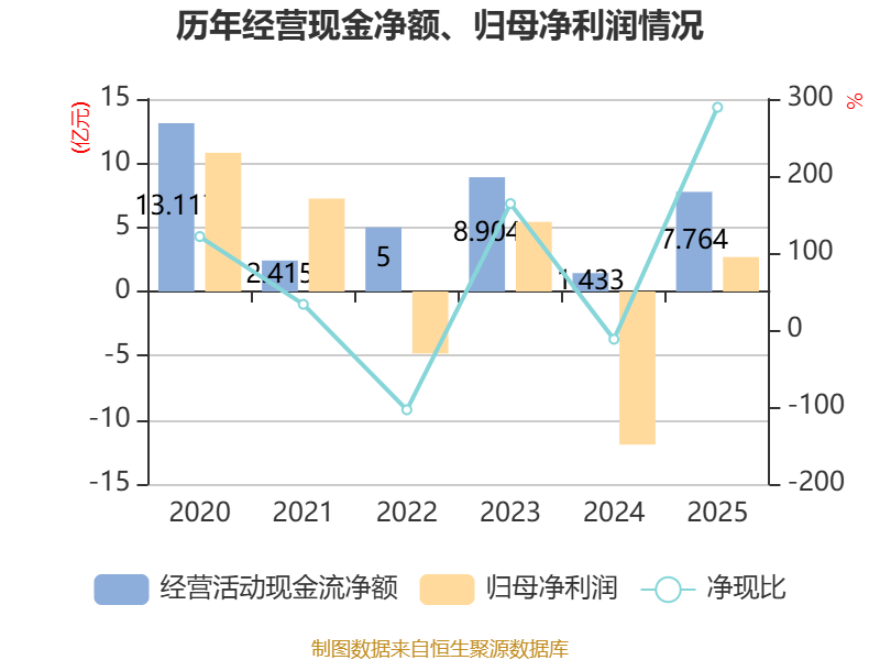 截至2025年,公司经营活动现金流净额为7.76亿元,同比增长441.85%;筹资活动现金流净额-2.03亿元,同比增加2.39亿元;投资活动现金流净额-9.08亿元,上年同期为-3.16亿元。