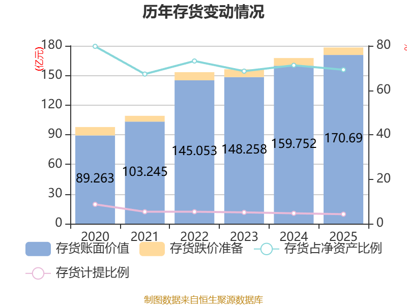 从存货变动来看,截至2025年末,公司存货账面价值为170.69亿元,占净资产的69.21%,较上年末增加10.94亿元。其中,存货跌价准备为7.59亿元,计提比例为4.26%。