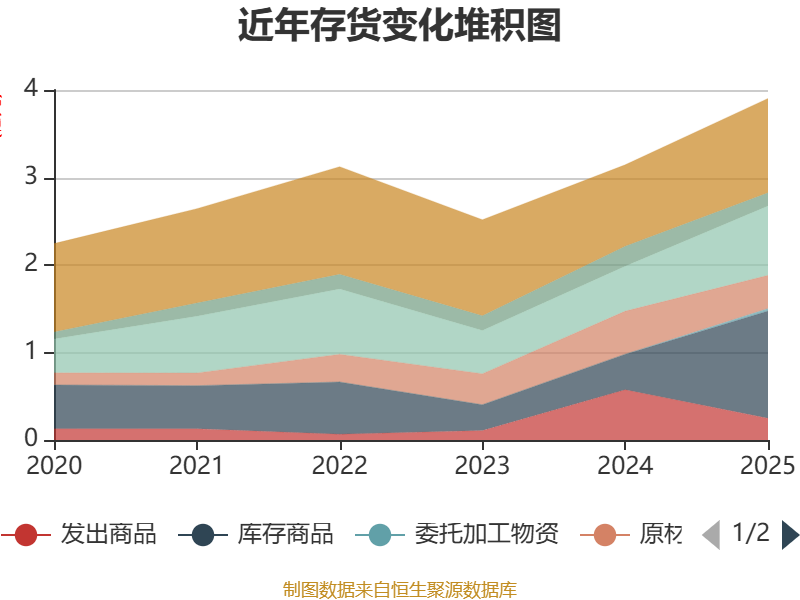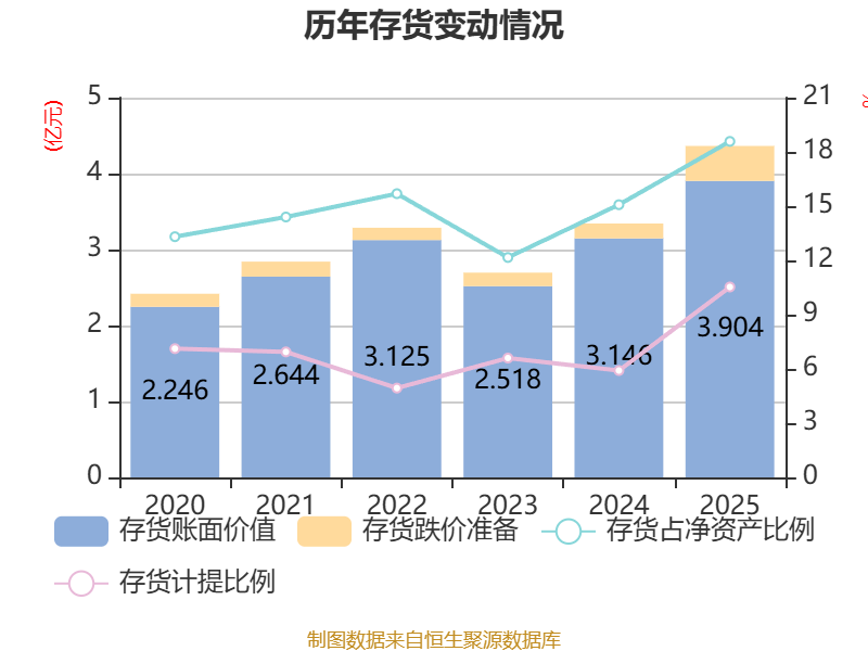 从存货变动来看,截至2025年末,公司存货账面价值为3.9亿元,占净资产的18.58%,较上年末增加7587.21万元。其中,存货跌价准备为4596.95万元,计提比例为10.53%。