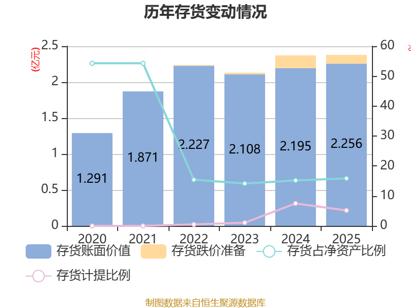 从存货变动来看,截至2025年末,公司存货账面价值为2.26亿元,占净资产的15.85%,较上年末增加612.53万元。其中,存货跌价准备为1228.46万元,计提比例为5.16%。