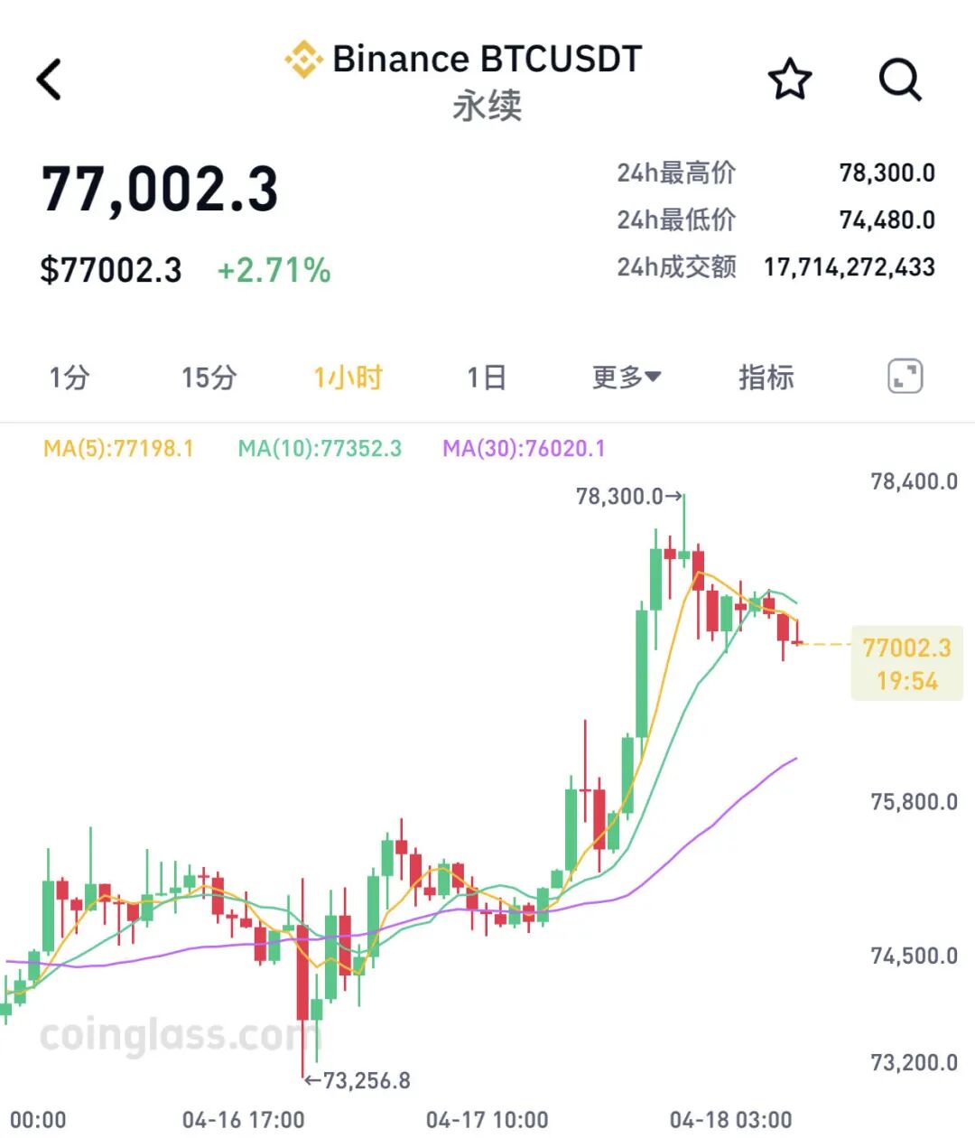 4月18日,虚拟货币市场普涨,截至发稿,比特币涨近3%,报77002.3美元/枚。
