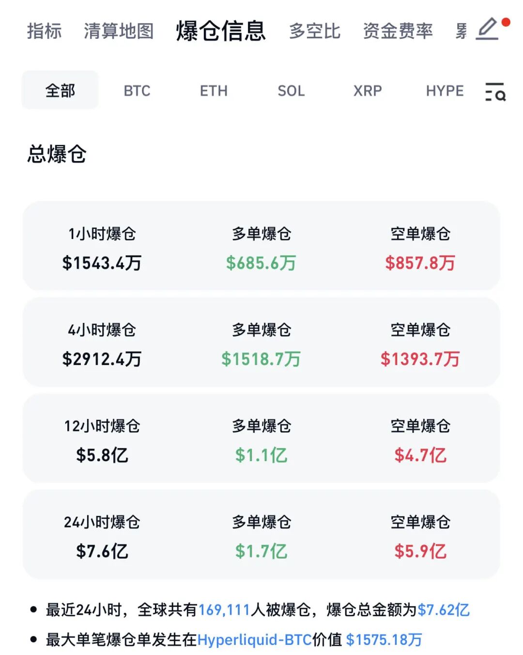 CoinGlass数据显示,过去24小时内,加密货币市场共有近17万人爆仓,爆仓总金额超7亿美元。