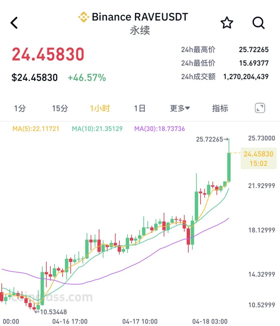 除了比特币,RAVE大涨超46%,ENA涨超10%,以太坊涨近3%,XRP涨超2%,BNB、HYPE涨超1%。