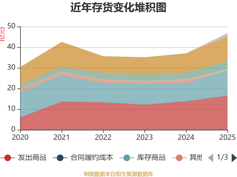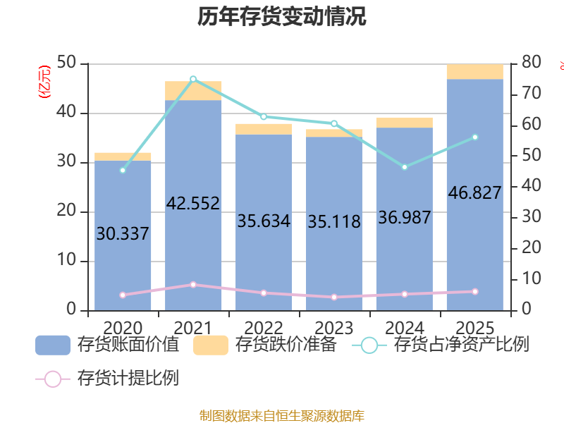 从存货变动来看,截至2025年末,公司存货账面价值为46.83亿元,占净资产的56.11%,较上年末增加9.84亿元。其中,存货跌价准备为3.01亿元,计提比例为6.04%。